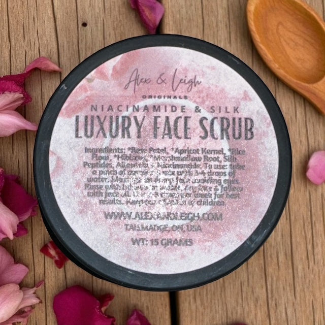 Experience refined skincare with this Luxury Niacinamide + Silk Powder Face Scrub, a blend of organic botanicals and advanced ingredients designed to elevate your complexion. Rose Petal and Hibiscus powders gently exfoliate and brighten while reducing inflammation and promoting collagen. Apricot Kernel and Rice Flour powders smooth texture and absorb excess oil for a polished finish. Marshmallow Root and Allantoin powders hydrate, soothe, and protect, supporting skin repair. Silk Peptide enhances glide, leaving your skin luxuriously soft and smooth with improved tone and elasticity. This sophisticated formula ensures a radiant, balanced complexion with every use.
